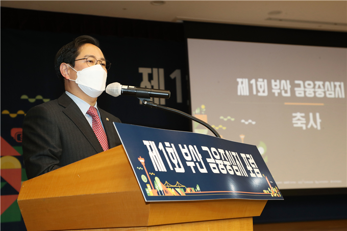 ▲28일 국민의힘 박수영 국회의원(남구갑) 부산국제금융센터(BIFC)에서 열린 제1회 부산 금융중심지 포럼 출범식에서 축사를 하고 있다. 박수영 국회의원 사무실 제공 |