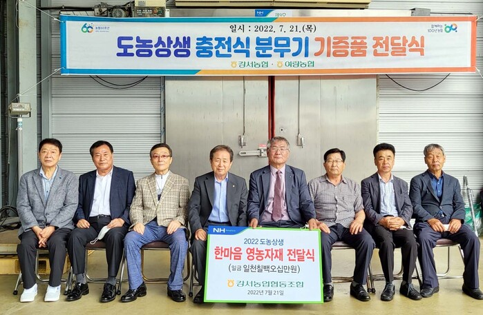 이날 강서농협 한명철 조합장은 여량농협 지한규 조합장에게 도농상생 한마음 영농자재 전달식에서 전동식 분무기 100대(1750만원원 상당)를 농축협 균형발전 및 상호협력적 문화구축을 위해 전달했다.