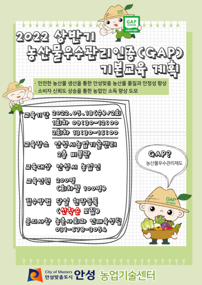 이번 실시하는 GAP 교육은 당일 현장접수로 선착순 모집하며, 기타 상세사항은 안성시농업기술센터 농촌사회과 인재육성팀으로 문의하면 된다.