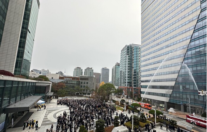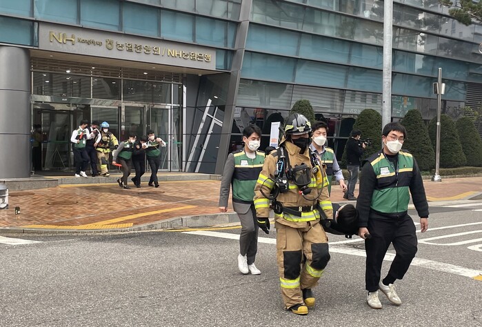 ▲ 22일 서울시 중구 농협 중앙 광장에서 열린 2022년 재난대응 안전한국훈련 중 화재대피 훈련을 실시하고 있다. 농협 제공 |
