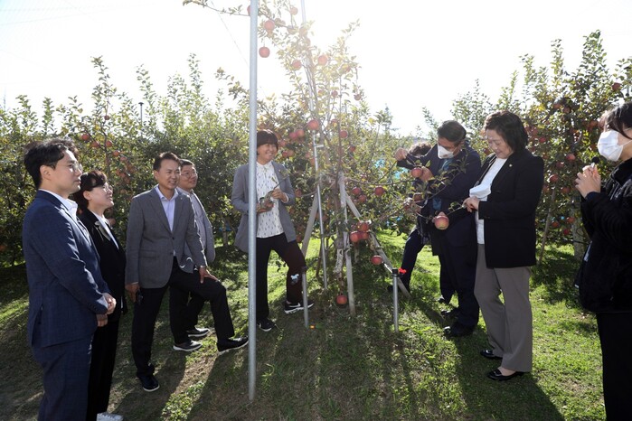 이날 유준숙 위원장을 비롯한 소속 의원들은 과수공원 조성 및 운영 현황 청취하고, 농장을 둘러보면서 과수공원이 시행하고 있는 사업 현황과 과수재배 현황을 점검했다.