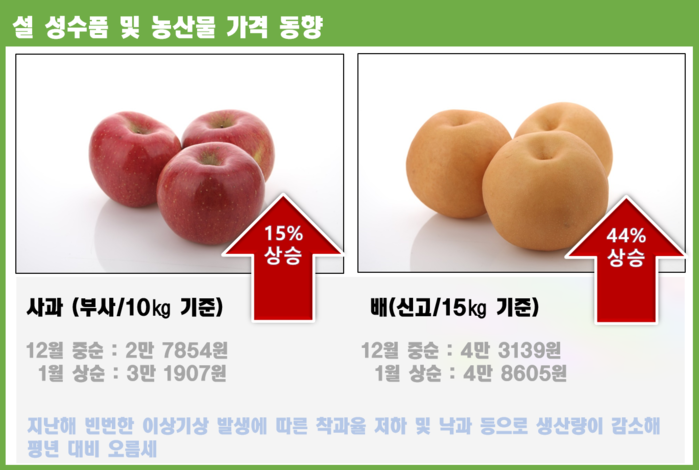 사과(부사)는 12월 중순 2만 7854원(10㎏ 기준)에서 이달 상순 3만 1907원으로 상승했고, 배(신고)는 12월 중순 4만 3139원(15kg 기준)에서 4만 8605원으로 평년대비 44% 올랐다.