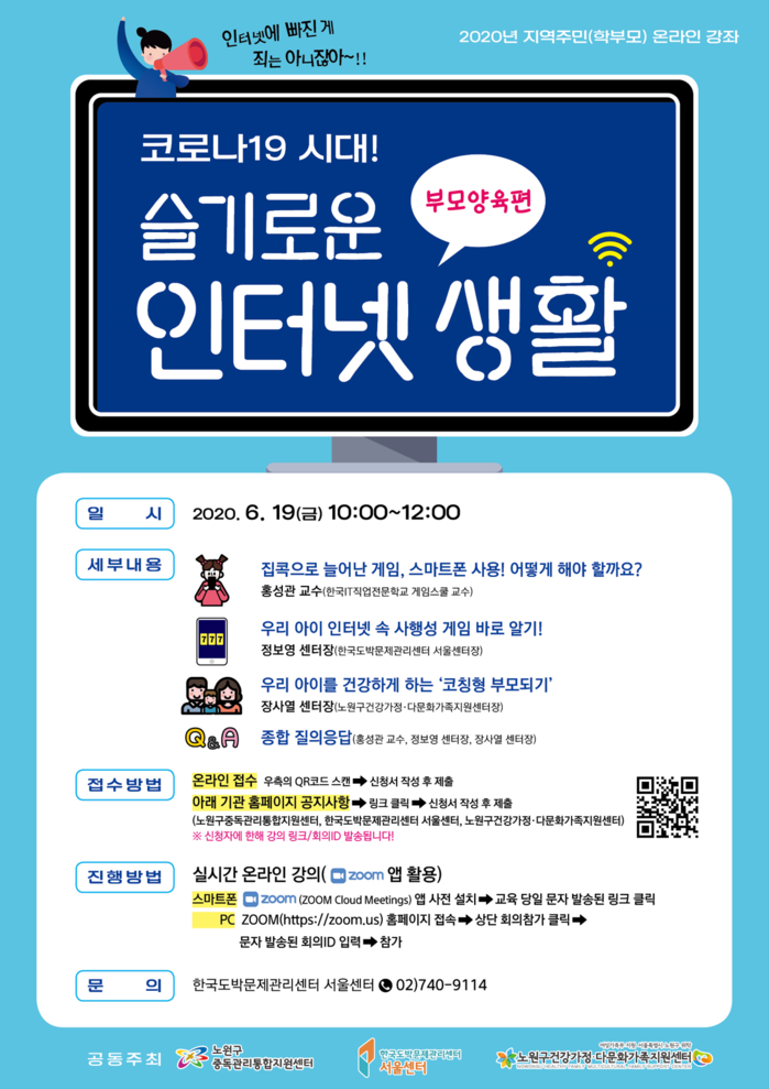 한국도박문제관리센터 서울센터(이하 서울센터)는 오는 19일 오전 10시 노원구 중독관리통합지원센터, 건강가정지원센터와 함께 지역주민을 위한 온라인 특강 “코로나-19 시대, 슬기로운 인터넷 생활: 부모양육편”을 개최한다.