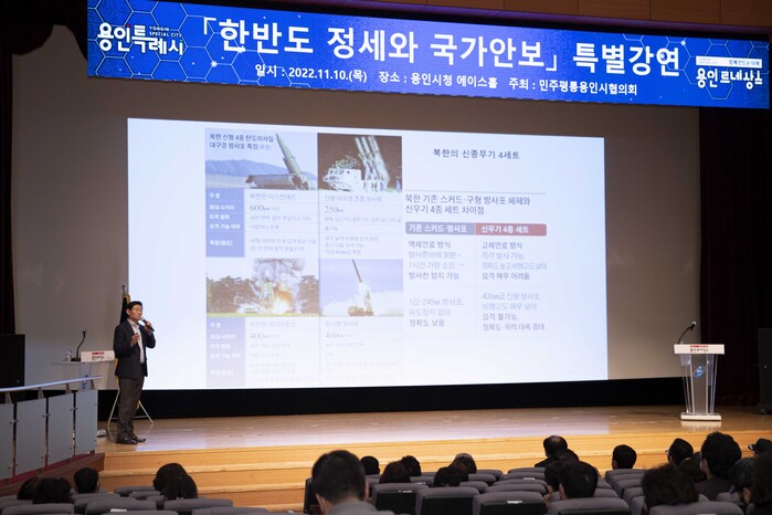 | ▲ 이상일 용인특례시장이 한반도 정세와 국가 안보를 주제로 북한의 최근 도발 양상을 설명하고 있다. |