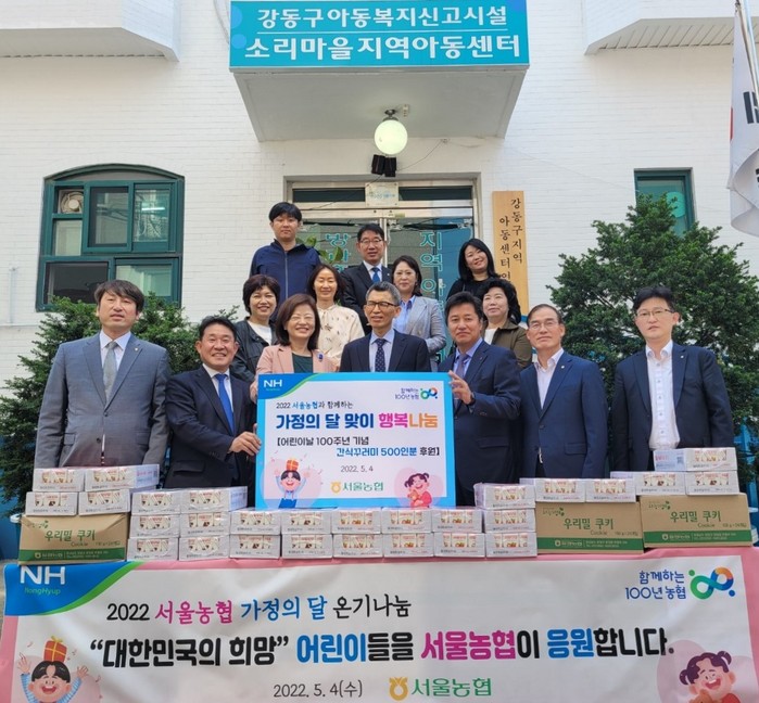 서울농협(본부장 황준구)은 '제100회 어린이날'을 맞아 4일 강동구에 소재한 강동구 지역아동센터 연합회를 방문해 서울우유농협 멸균우유 1,000개, 우리밀 과자 500개로 구성된 간식꾸러미 전달식을 가졌다.
