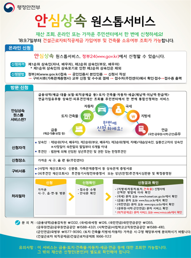 안심상속서비스는 6개월 이내 사망신고 시 금융거래, 토지, 자동차, 국세‧지방세, 국민‧공무원‧사립학교교직원연금 등 재산을 한 번에 조회신청 할 수 있는 서비스다.