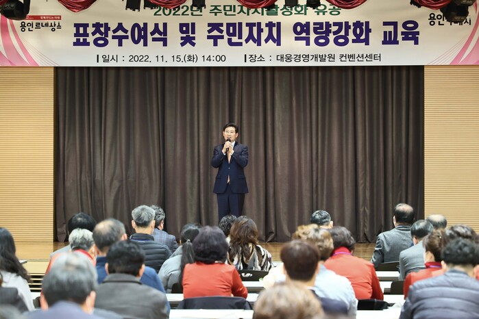 | ▲ 이상일 시장이 15일 ‘2022 주민자치활성화 유공 표창수여식’에 참석해 인사말을 하고 있다. 용인시 제공 |