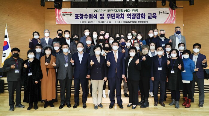 | ▲ 이상일 시장이 15일 ‘2022 주민자치활성화 유공 표창수여식’에서 참석자들과 기념촬영을 하고 있다. |