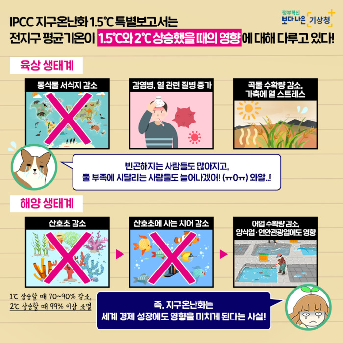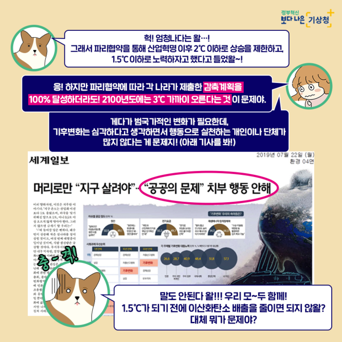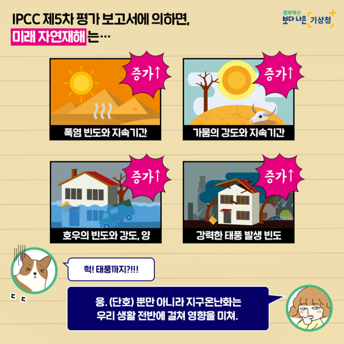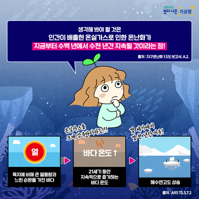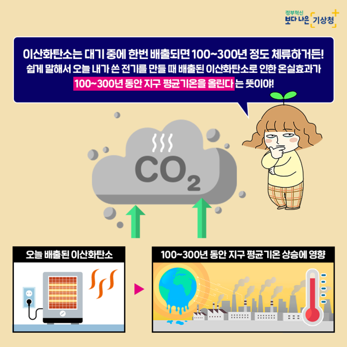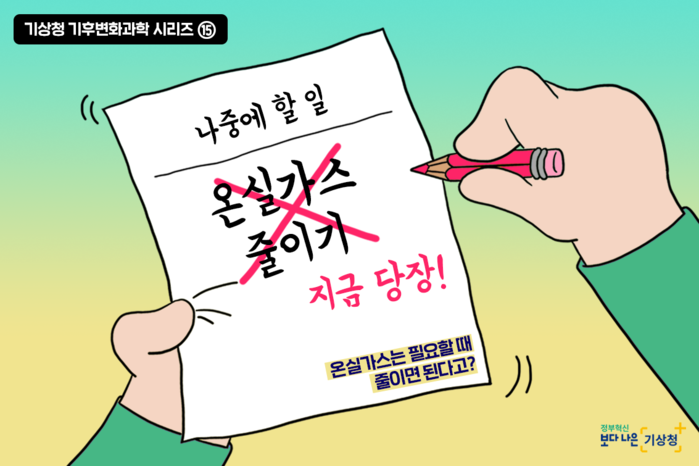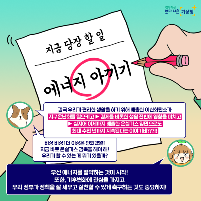 기상청은 “한번 배출된 온실가스가 소멸되는 데 최소 100년에서 300년까지 소요됨에 따라서 점점 증가하고 있는 폭염, 가뭄, 호우, 태풍의 빈도와 강도를 줄이기 위해서는 에너지 절약은 지금 당장 시행해야 할 행동”이라고 강조했습니다.