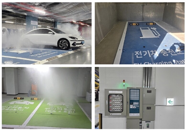 전기차 화재 확산방지 시스템은 전기차 화재 발생시 불꽃감지기, 바닥의 열(온도)감지기로 즉각 감지하고, 이후 자동으로 차량 하부 8개 소화수 냉각 노즐과 측면 부채꼴 형태 노즐에서 분당 240L의 물이 3kgf/cm2 이상의 높은 압력으로 방출돼 화재를 빠르게 진화하는 시스템이다. 시스템 작동은 ▲1단계 화재감지(열(온도)감지) ▲2단계 불꽃감지 ▲3단계 화재 알림 ▲4단계 1차 밸브개방 ▲5단계 2차밸브개방(밸브자동개방) ▲6단계 8개 노즐방사 등 총 6단계로 2분 이내에 신속하게 이뤄진다.