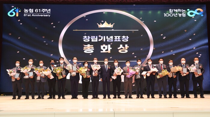 ▲이성희 농협중앙회장(가운데)이 11일 오후 서울 중구 농협중앙회 본관에서 개최된 창립 61주년 기념식에서 농업, 농촌 및 농협 발전에 기여한 공로로 수상의 영예를 안은 임직원들과 기념촬영을 하고 있다.