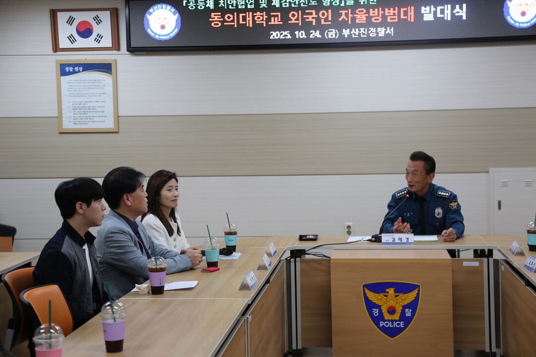 [로컬세계 = 맹화찬 기자] 부산 부산진경찰서는 24일 오후 부산진경찰서 3층 회의실에서 공동체 치안협업 및 체감안전도 향상을 위해 동의대 국제교류처, 유학생지원센터, 글로벌 혁신센터, 경찰 등 총 50여명과 함께 동의대학교 외국인 순찰대를 자율방범대로 신설하는 발대식을 개최했다.