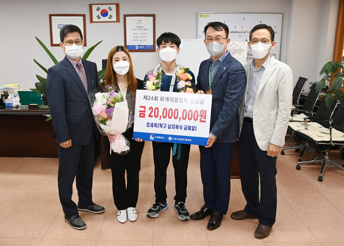 봉납식은 25일 조청식 수원시장 권한대행 집무실에서 열렸다. 조청식 권한대행은 오세욱 선수에게 포상금 2000만 원을 수여했다.