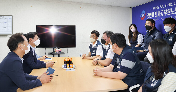 ▲이상일 용인특례시장이 8일 용인특례시공무원노동조합 사무실에서 노조 집행부와 이야기를 나누고 있다. |