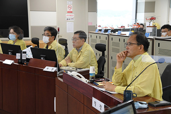▲산사태 회의 하는 박종호 산림청장(오른쪽). 사진=산림청 |