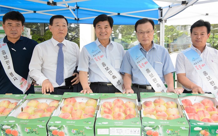 [로컬세계 오영균 기자]이춘희 세종시장(왼쪽 세번째)과 이해찬 국회의원(왼쪽 네번째) 등이 3일 국회 후생관 마당에서 세종조치원 복숭아 판촉활동을 벌이며 시민들을 맞이하고 있다.