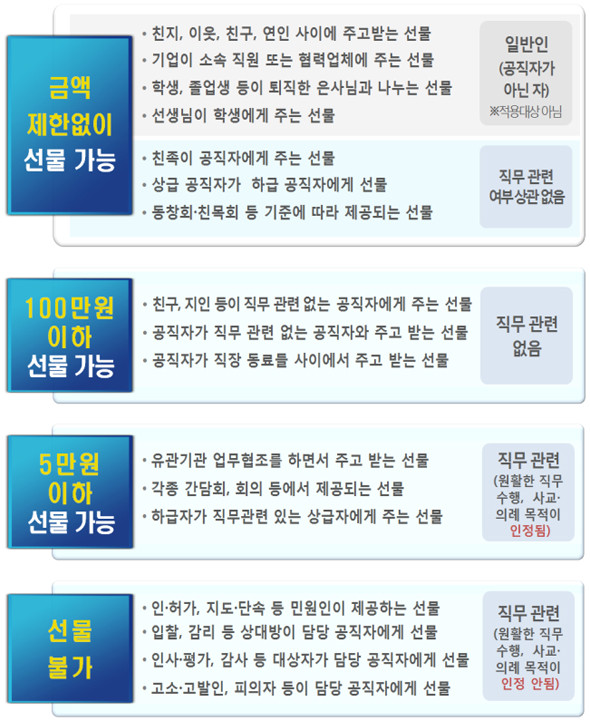 따라서 ▲친구·지인 등이 직무 관련 없는 공직자에게 주는 선물 ▲공직자가 직무 관련 없는 공직자와 주고 받는 선물 ▲공직자가 직장 동료들과 주고 받는 선물 등은 5만원을 넘어서도 가능하다.