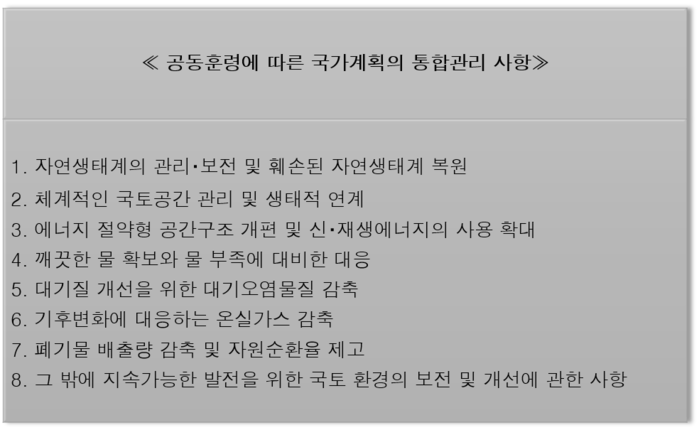 국토교통부의 ‘제5차 국토종합계획’(2020~2040)과 환경부의 ‘제4차 국가환경종합계획 수정계획’의 계획기간을 일치시키고 지속가능한 국토·환경을 위한 국가계획 통합관리 방안을 논의하게 된다.
