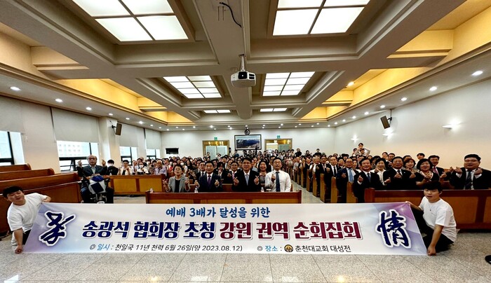 가정연합 춘천대교회(최창국 대교회장)는 송광석 한국협회장이 취임 후 처음으로 지난 12일 오후 춘천대교회를 방문, 강원권역 가정연합 목회자 부부 및 중심 신도들 300여 명과 소통의 시간을 가졌다고 밝혔다.