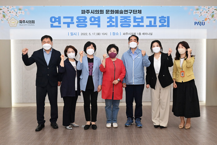 이번 최종보고회는 파주시의회 문화예술 연구단체 윤희정 대표의원을 비롯해 최유각, 박은주 의원, 파주시 문화예술과장 및 관계 공무원, 용역사인 공연·기획 분야 전문업체 스테이지모아의 김혜란 대표가 참석한 가운데 진행되었으며, 파주 관내의 문화자원을 영역별로 조사하고 분석하여 각각의 활용방안을 도출함으로써 거시적으로 파주의 문화·예술 정책이 지향해야 할 방향을 제시하는 계기를 마련했다.