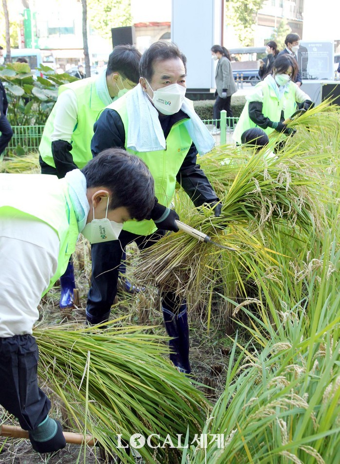 농협중앙회 농업박물관은 25일 서울 중구 농업박물관 앞 야외체험농장에서 전통 방식 벼 가을걷이 행사를 개최했다.