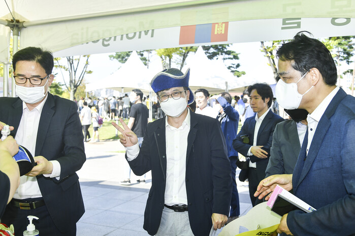 ▲ 김병수 김포시장이 25일 오후 한강중앙공원에서 열린 ‘2022년 제15회 김포 세계인 큰잔치’ 행사에 참석, 몽골 국가 문화 체험부스에서 전통모자를 쓴 모습이다. 김포시 제공 |