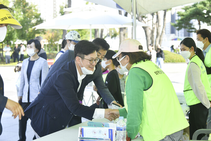▲ 김병수 김포시장이 25일 오후 한강중앙공원에서 열린 ‘2022년 제15회 김포 세계인 큰잔치’ 행사에 참석, 자원봉사자 및 행사 진행 관계자들을 격려하는 모습이다. |