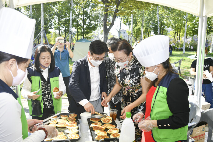 ▲ 김병수 김포시장이 25일 오후 한강중앙공원에서 열린 ‘2022년 제15회 김포 세계인 큰잔치’ 행사에 참석, 중국 국가 문화 체험부스에서 전통음식 만들기에 참여한 모습이다. |