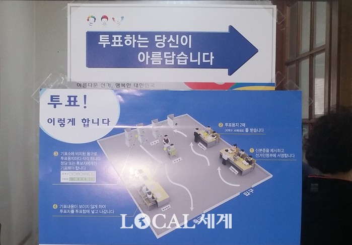 ▲서울의 한 투표소에 안내문이 걸려 있다. 라안일 기자. |