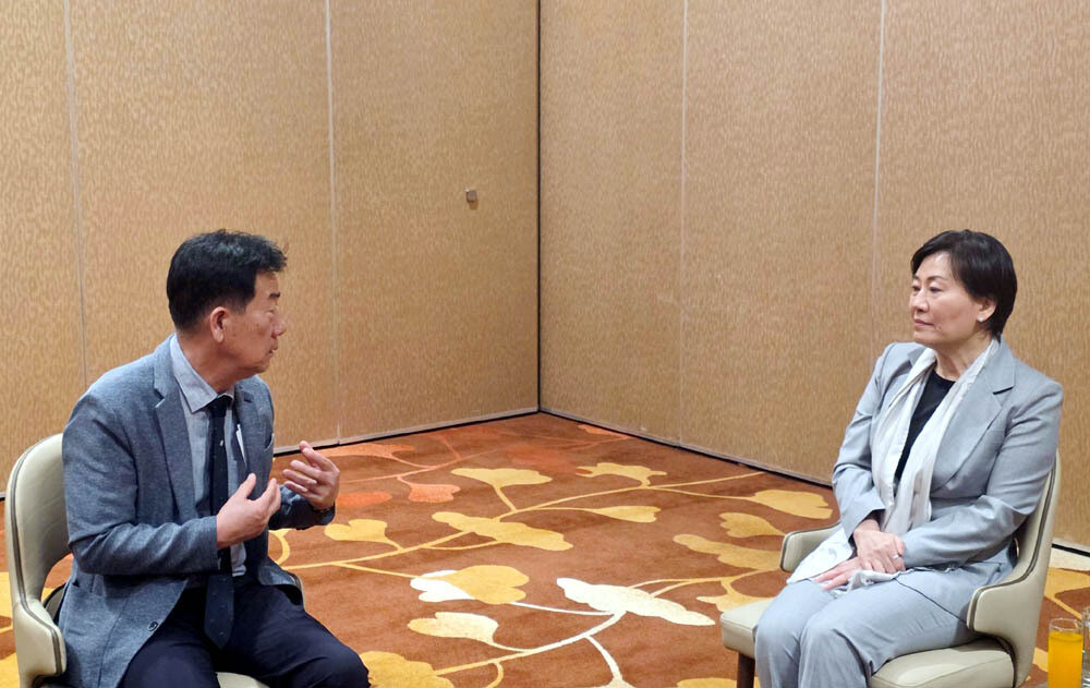 민경천 한우자조금관리위원장과 송미령 농림축산식품부 장관이 한우 수출 경쟁력 제고 방안에 대해 의견을 나누고 있다.