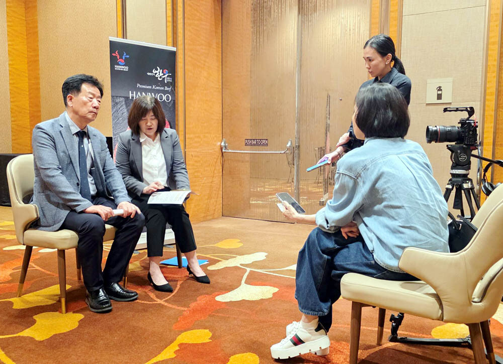 민경천 한우자조금관리위원장이 싱가포르 현지 언론을 대상으로 한우의 우수성에 대해 인터뷰하고 있다.