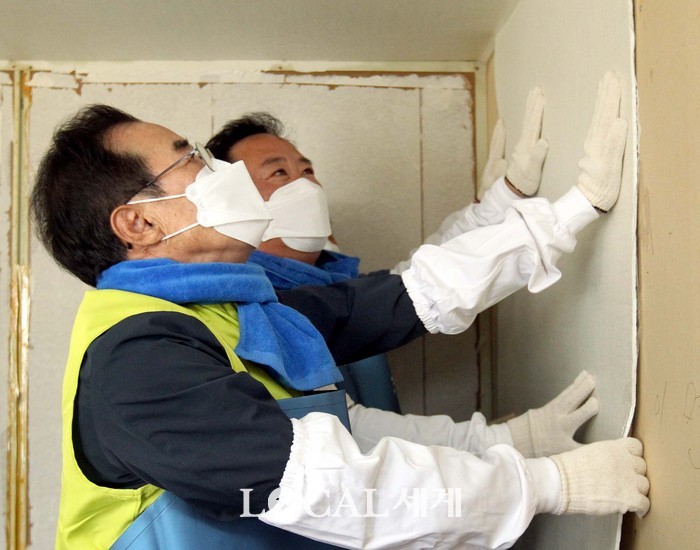 ▲이성희 농협중앙회장(사진 맨앞)이 '사랑의 집 고치기' 봉사활동을 위해7일 충남 당진시 관내 농가를 찾아 어기구 국회의원(충남 당진시, 농해수위, 사진 안쪽)과 함께 벽지 도배작업을 하고 있다. |