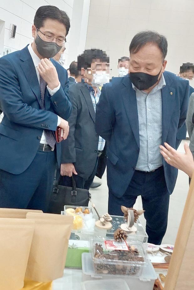 ▲ 7일 세종시 정부세종컨벤션센터에서 열린 제4회 곤충의 날 기념식에서 조재철 농협경제지주 축산기획본부장(사진 오른쪽), 강형석 농림축산식품부 기획조정실장(사진 왼쪽)이 전시된 곤충관련 제품을 관람하고 있다. 농협 제공 |