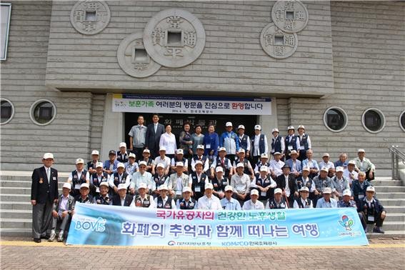 ▲보훈가족 70여명이 14일 조폐공사 초청으로 화폐박물관을 방문해 기념촬영을 하고 있다. |