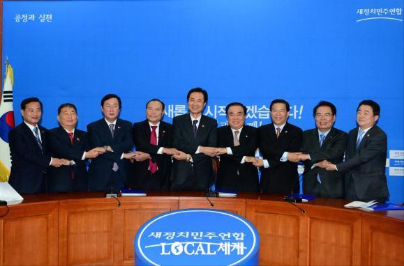 ▲ 27일 전국시·도의회의장협의회 임원단은 간담회를 마치고 새정치민주연합 당사를 방문했다. © 로컬세계 |