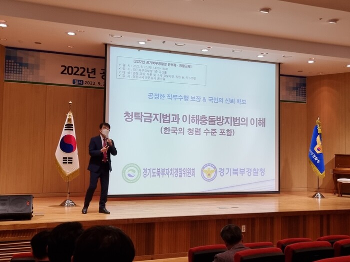 [로컬세계=이혁중 기자] 경기도북부자치경찰위원회는 경기북부경찰청과 합동으로 22일 오후 경기북부경찰청 다산홀에서 경찰공무원 및 위원회 사무국 직원 등 100여 명을 대상으로 청렴도 향상을 위한 교육을 개최했다고 밝혔다.