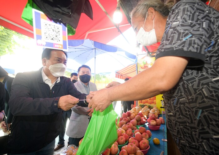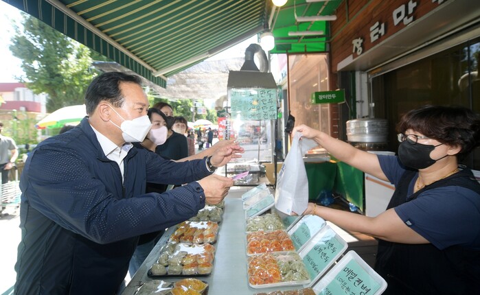 [로컬세계=김병민 기자] 이권재 오산시장이 7일 추석 상차림 장을 보기 위해 100년 전통의 오산 오색시장을 찾았다.