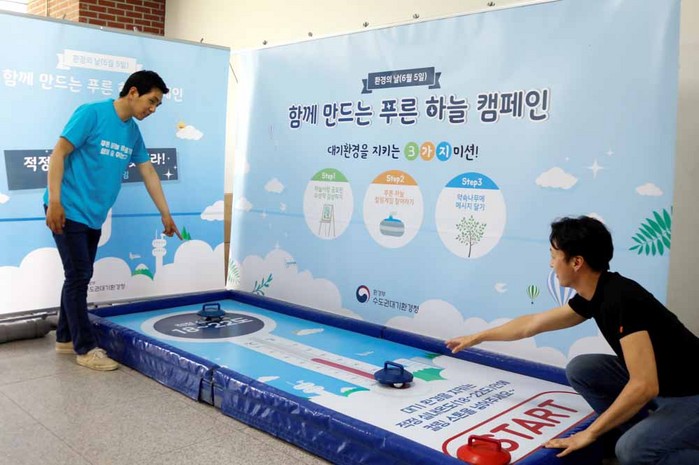 ▲환경부 수도권대기환경청(청장 김동구)이 제23회 환경의 날을 맞이해 5일 오후 경기 안산시 전철 4호선 상록수역에서 진행한 '「함께 만드는 푸른 하늘 캠페인' 행사 현장. '푸른 하늘 컬링게임'에 참여한 한 시민이 적정 실내온도(18~22도)가 적힌 컬링판의 원 안에 스톤을 넣고 있다.(수도권대기환경청 제공) |