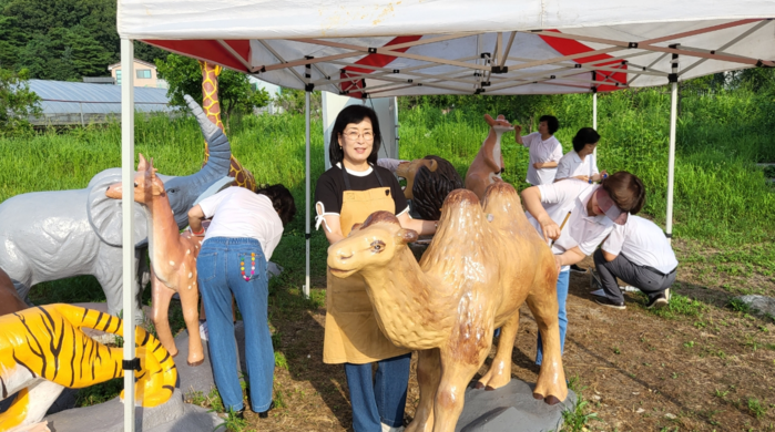 ▲ 양숙희 의원이 춘천시 동면 장학2리 마을 입구를 단장하기 위한 동물조형물 설치작업을 하고 있다. 강원도의회 제공 |