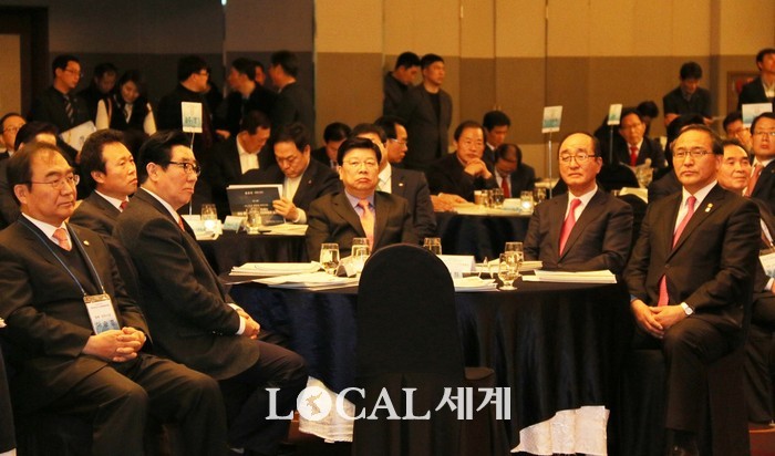 ▲전국시장·군수·구청장협의회 최명희 대표회장(강릉시장,오른쪽 첫번째), 심대평 지방발전위원회 위원장(오른쪽에서 두번째), 권선택 대전시장(가운데)이 축사를 듣고 있다. 오영균 기자 |