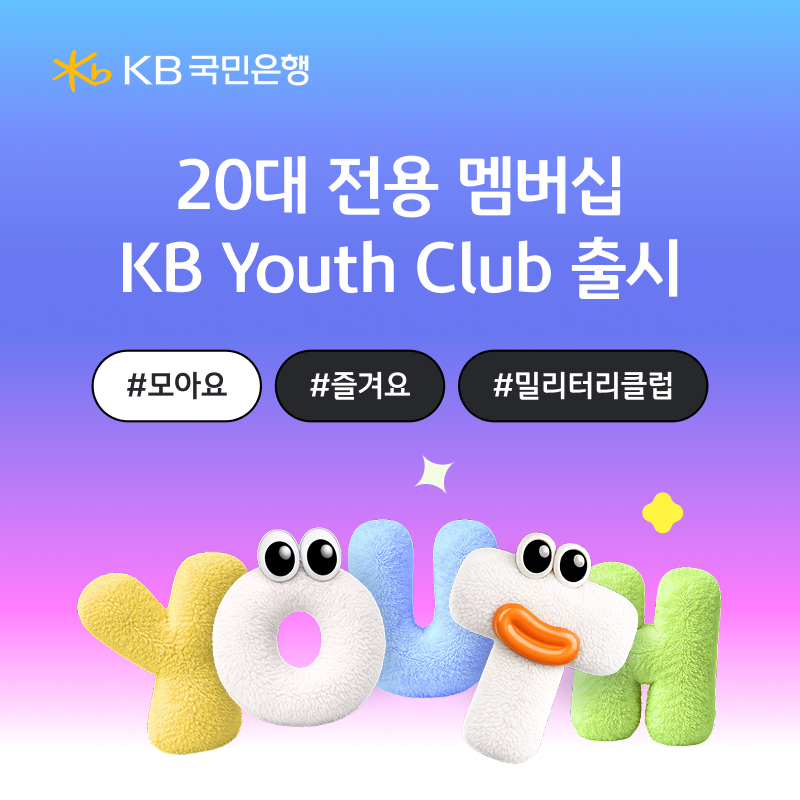 'KB Youth Club'은 KB스타뱅킹을 통해 만 18세부터 29세까지의 고객이라면 누구나 무료로 이용 가능한 멤버십 서비스이다. 일상 속 미션과 참여형 챌린지를 통해 20대 고객이 금융을 보다 친근하게 경험할 수 있도록 다양한 서비스와 혜택을 제공한다.