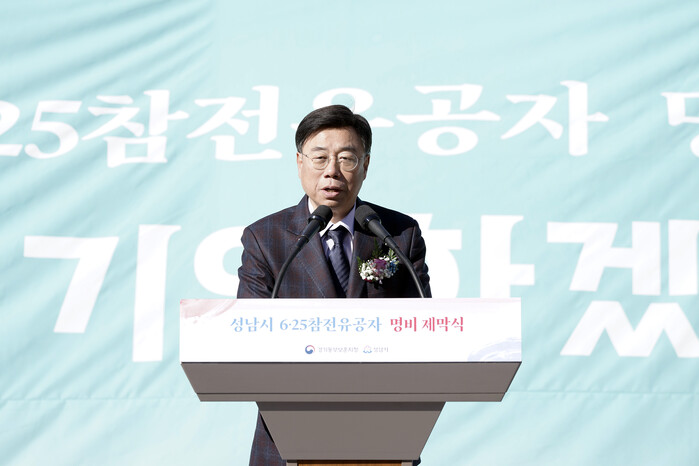 | ▲신상진 시장이 30일 열린 성남지역 6·25 참전유공자 4725명 명비 제막식에서 인사말을 하고 있다. 성남시 제공 |