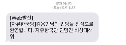 그는 자신의 SNS에 자유한국당 인명진 비상대책위원장 명의로 받은 “김용민님의 입당을 진심으로 환영한다”라는 입당 축하 문자 메시지를 올렸다.