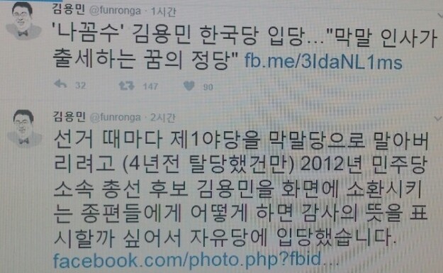 17일 오후 김 씨는 자신의 SNS를 통해 “선거 때마다 제1야당을 막말당으로 말아버리려고(4년전 탈당했건만) 2012년 민주당 소속 총선 후보 김용민을 화면에 소환시키는 종편들에게 어떻게 하면 감사의 뜻을 표시할까 싶어서 자유당에 입당했습니다”고 밝혔다.