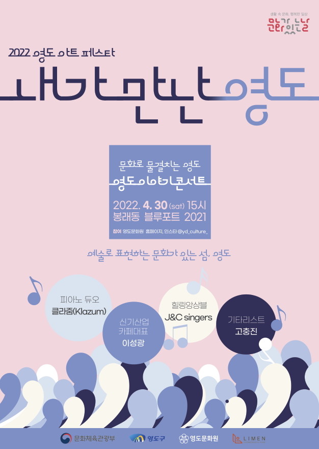 [ 로컬세계 부산=맹화찬 기자 ]부산시 영도구는 오는 4월 30일(토) 오후 3시, 봉래동 블루포트 2021(봉래나루로 138)에서‘2022 영도 아트 페스타’의 첫 번째를 장식할 공연 '내가 만난 영도'를 개최한다고 27일 밝혔다.