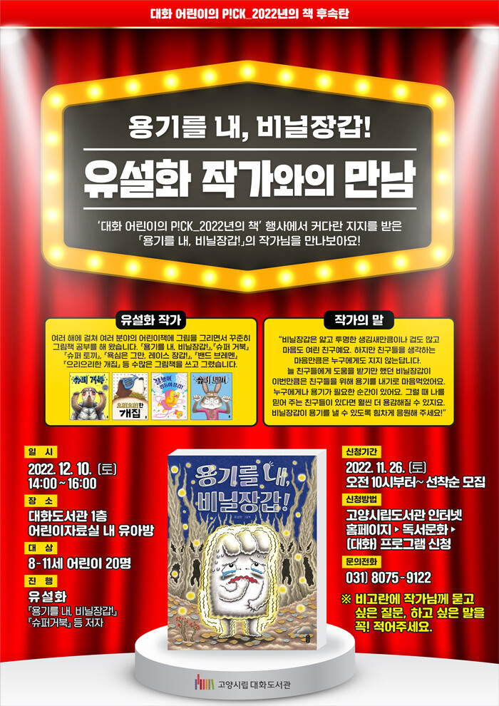 [로컬세계 = 이영원 기자]경기 고양특례시(시장 이동환) 대화도서관이 오는 12월 10일, 어린이자료실에서 ‘용기를 내, 비닐장갑!’의 저자 유설화 작가와의 만남을 진행한다.