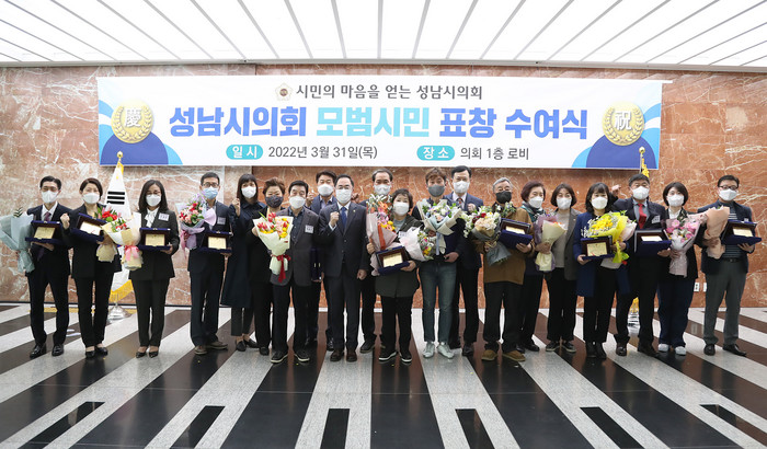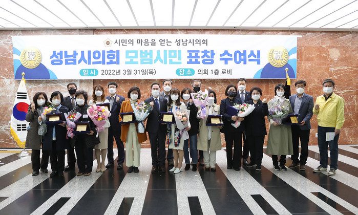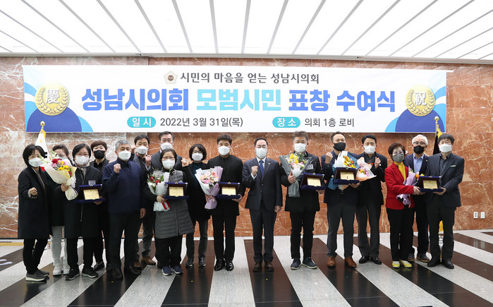 [로컬세계 김병민 기자]경기 성남시의회(의장 윤창근)는 31일 1층 로비에서 2022년 1분기 모범 시민 표창 수여식을 개최했다.