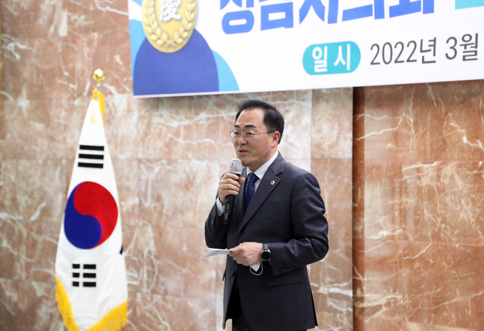 ▲31일 열린 '2022년 1분기 모범 시민 표창 수여식'에서 윤창근 성남시의회 의장이 인사말을 하고 있다. 성남시의회 제공 |