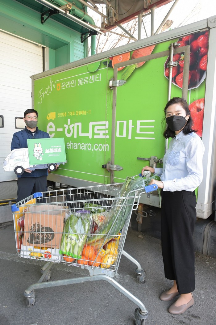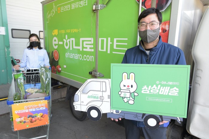 ▲4월 11일(월) 서울 용산구 농협하나로마트 용산점에서 직원들이 e-하나로마트 서비스 첫 시작을 알리는 배송을 준비하고 있다. 농협유통 제공 |