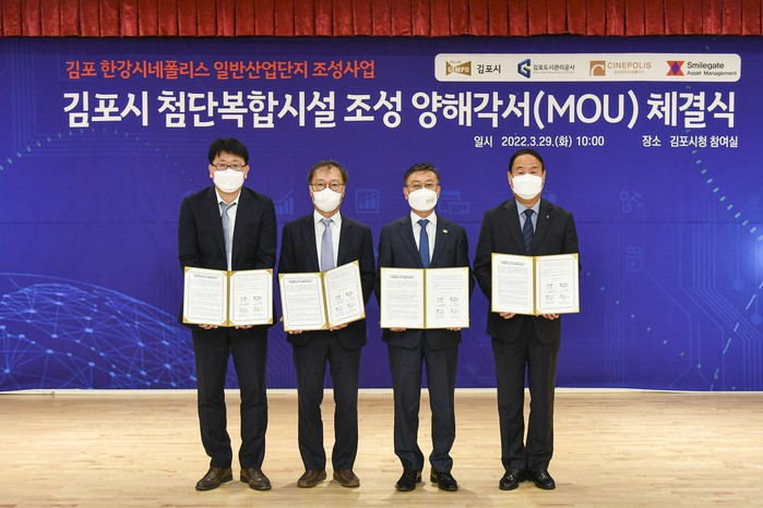 29일 김포시와 스마일게이트자산운용㈜, 김포도시관리공사, ㈜한강시네폴리스개발과 미래성장산업 육성 및 산학 상생협력을 위한 첨단복합시설 조성 양해각서(MOU)를 체결했다.